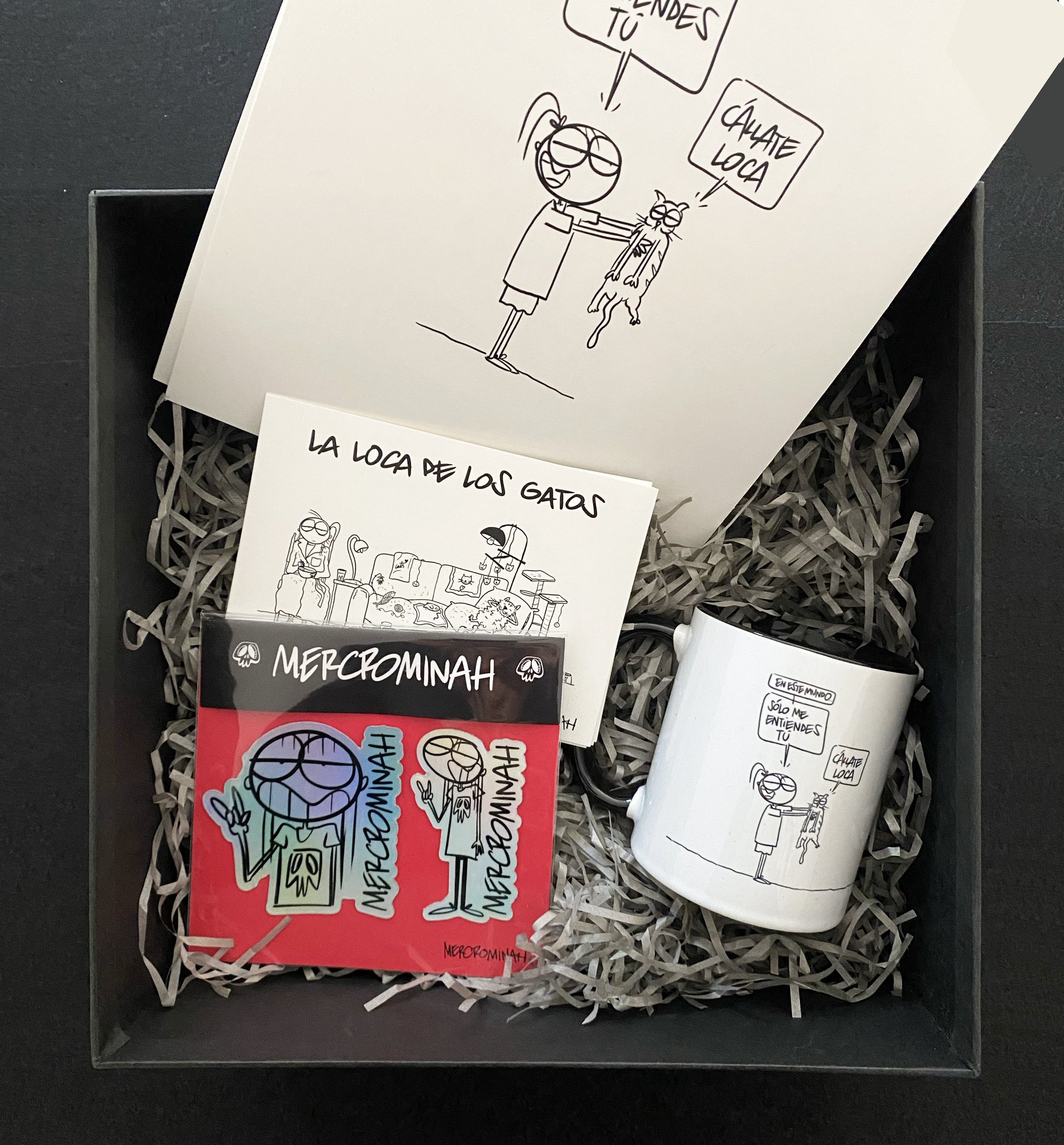 1 Print Cállate loca versión gato. 1 Taza Cállate loca versión gato. 1 Pack pegatinas holograficas 1 Pack de 4 postales de viñetas random diferentes.